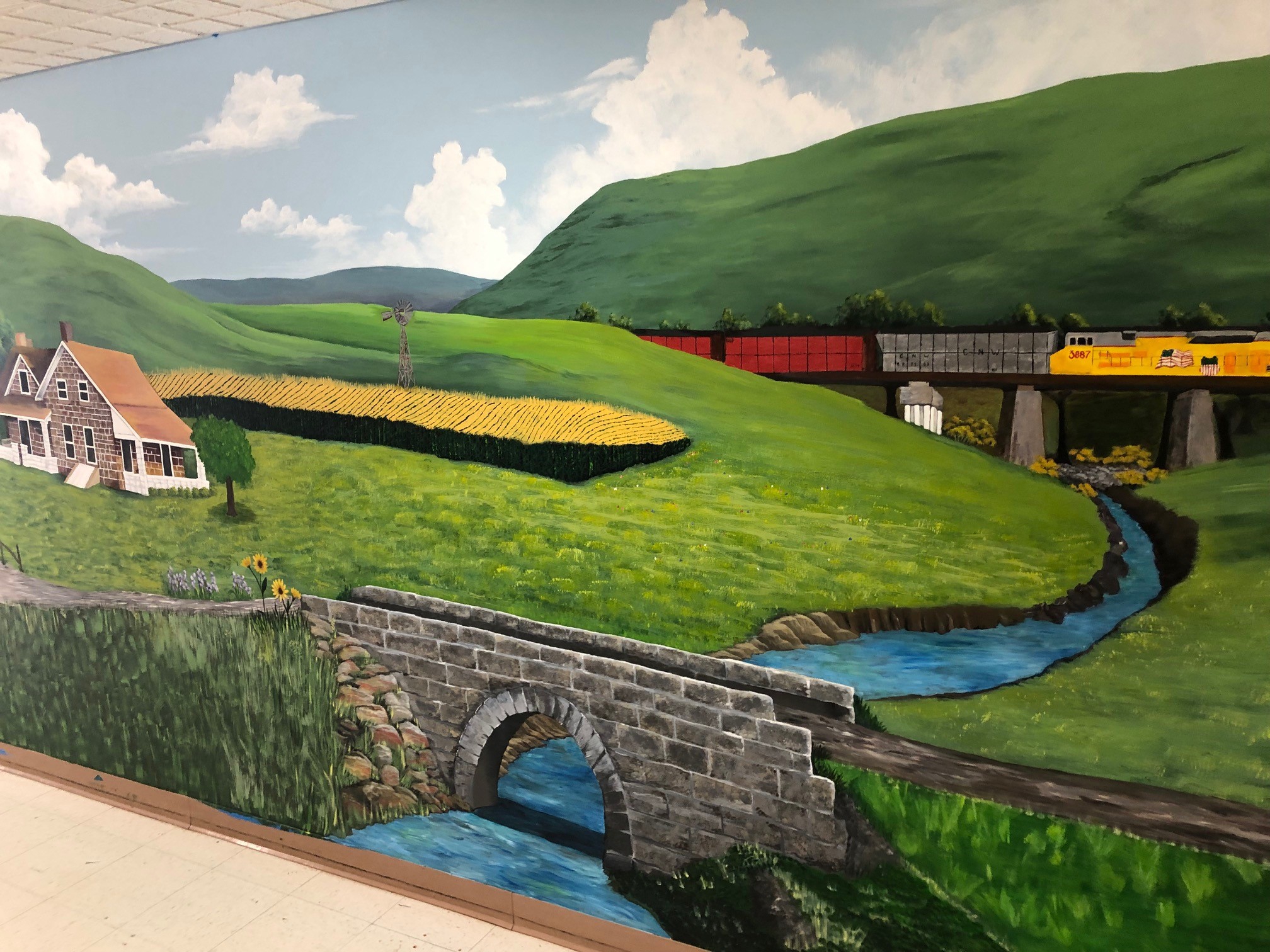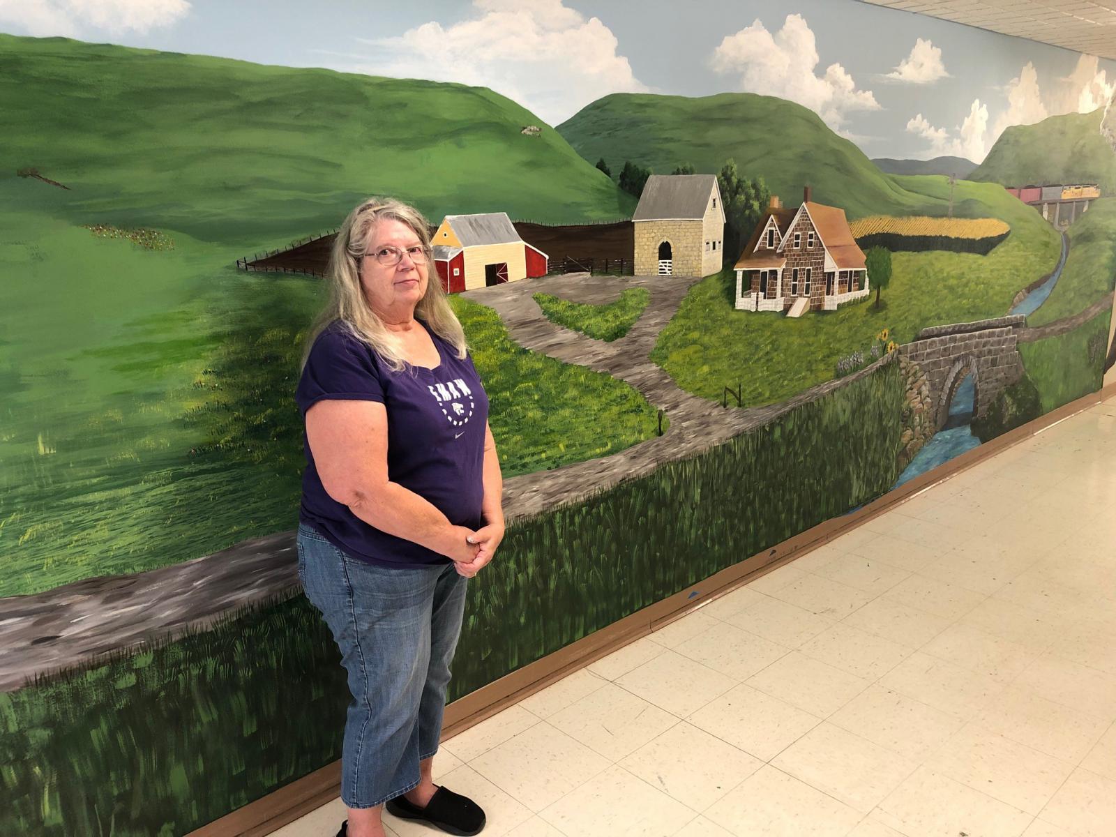 The hallway between the Fitness Center and the entrance to Redbud Plaza Assisted Living is graced with a recognizable local scene complete with pristine prairie, a cornfield, the Berges stone house and barn, the Henneberg stone barn, a creek burbling under a stone bridge, and a train heading off into the distance. The project was originally begun in 2018. When an artist who had been involved in the vision had to stop working on the mural because of other obligations, Erin Jeanneret-Lacey, a patient accounts representative in the Onaga Business Office, assumed responsibility and worked on it during her spare time. Progress was interrupted by the COVID-19 pandemic, but efforts resumed in the past few months. Onaga High School Art Teacher Becky Becker and Rock Creek High School Art Teacher Kyle Van Vogelpoel brought their students to help when possible, then Becker helped finish the project this summer.